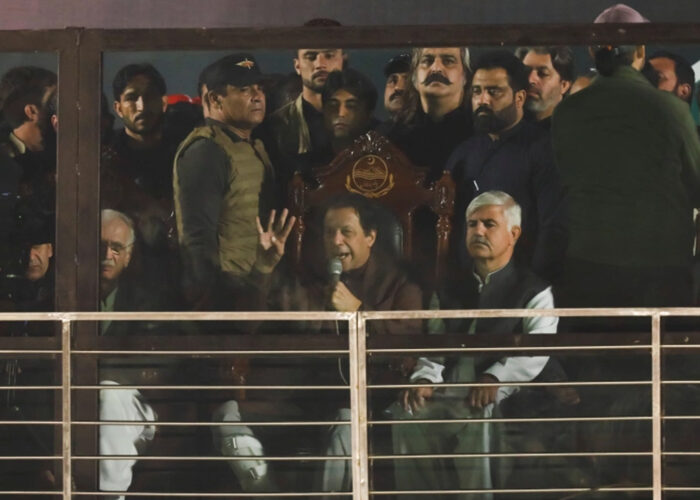 ووصل خان أمس السبت إلى المنصة مستندا وخاطب الحشد من خلف زجاج مضاد للرصاص، وقال إن عدة مصادر أمنية أبلغته بأن حياته لا تزال مهددة.